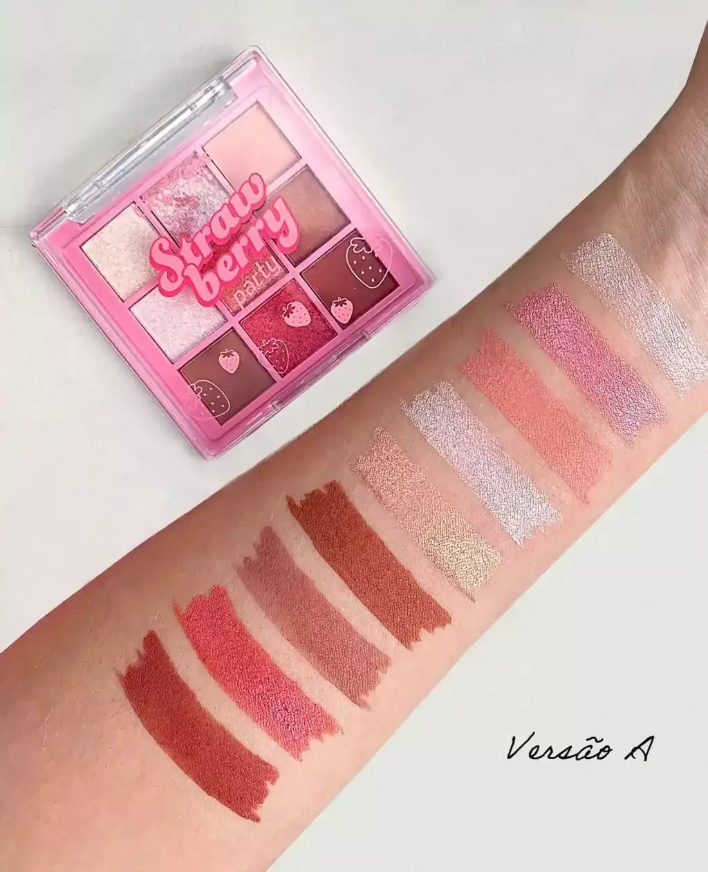 Preparados para a festa mais fofa e deliciosa que vocês vão participar? A Coleção Strawberry Party veio para trazer até você um festival do morango em forma de makes! São produtos divertidos e alegres que vão compor sua maquiagem de forma única! As paletas de sombras da Coleção têm um total de zero defeitos! São super compactas e contam com 9 cores de sombras com diversos acabamentos e texturas diferentes! Tem sombras matte, cintilantes, shimmer, matte com partículas de brilho e até marmorizadas que lembram doces feitos de morango, como o merengue ou sorvete com calda de morango... Hmmmm, deu até fome, né?